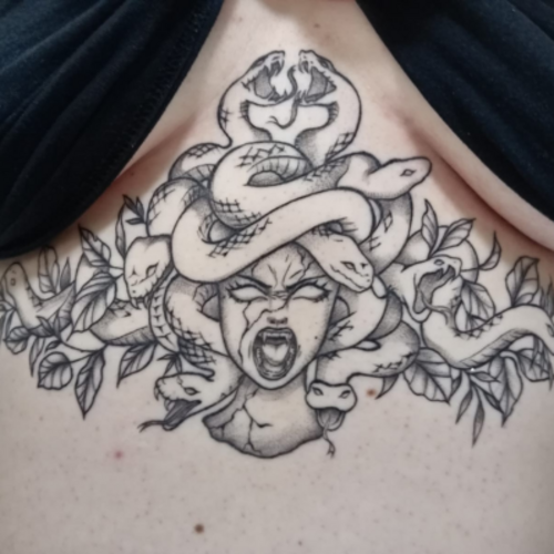 Medusa has become a symbol of strength for sexual assault survivors. I got this tattoo to commemorate surviving my SA and overcoming so much trauma after 10 years of PTSD. This tattoo means so much to me and having the amazing women of Vesper and Quill there supporting me during my 4 hour long tattoo was everything to me. This tattoo is a symbol of strength and resilience. Of never letting the monsters win that hurt us. ❤️🐍